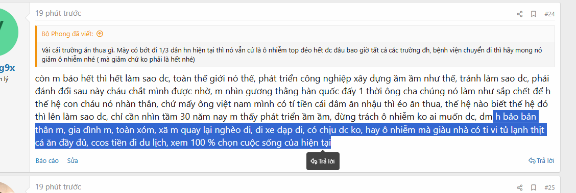 Tao ở quê, năm18 tuổi ông bà già cho lên Hà Nội học đại học, ở Hà Nội được 5-6 năm thì vào SG 2 năm làm việc sau. Giờ tao đang ở Đà Nẵng sống được gần 2 năm rồi đây. Ngày xưa tao cũng nghĩ kiểu gì cũng sống chết phải ở Hà Nội nhưng giờ thì thôi, dí buồi vào. Hà Nội giờ nó thập cẩm vkl, người tứ xứ dồn về thành ra nhiều chỗ dân trí thấp vãi lồn. Đúng như thằng thớt nói, ở đây ô nhiễm, hay ngập, bụi bẩn, rác khắp nơi... Bộ mặt cả nước mà như cái đầu buồi. Thế mà nhiều thằng vẫn nói Hà Nội đẹp, đéo hiểu đẹp cái mẹ gì. Chính phủ đang cố tình tăng giá nhà, đất để đuổi bớt dân ở Hà Nội đi thì phải. Giờ tầm 4 tỏi may ra mới có căn nhà ( cả gia đình) gọi là ổn để sống ở nội đô, đó là chung cư ấy nhé. Còn nhà trong ngõ hẻm thì 4 tỏi mua thừa nhưng xe máy thôi chứ ô tô đéo vào được. Giờ cầm 4 tỷ về quê xây được căn nhà mỹ mãn luôn. Nói chung là chất lượng cuộc sống ở Hà Nội càng ngày càng tệ.