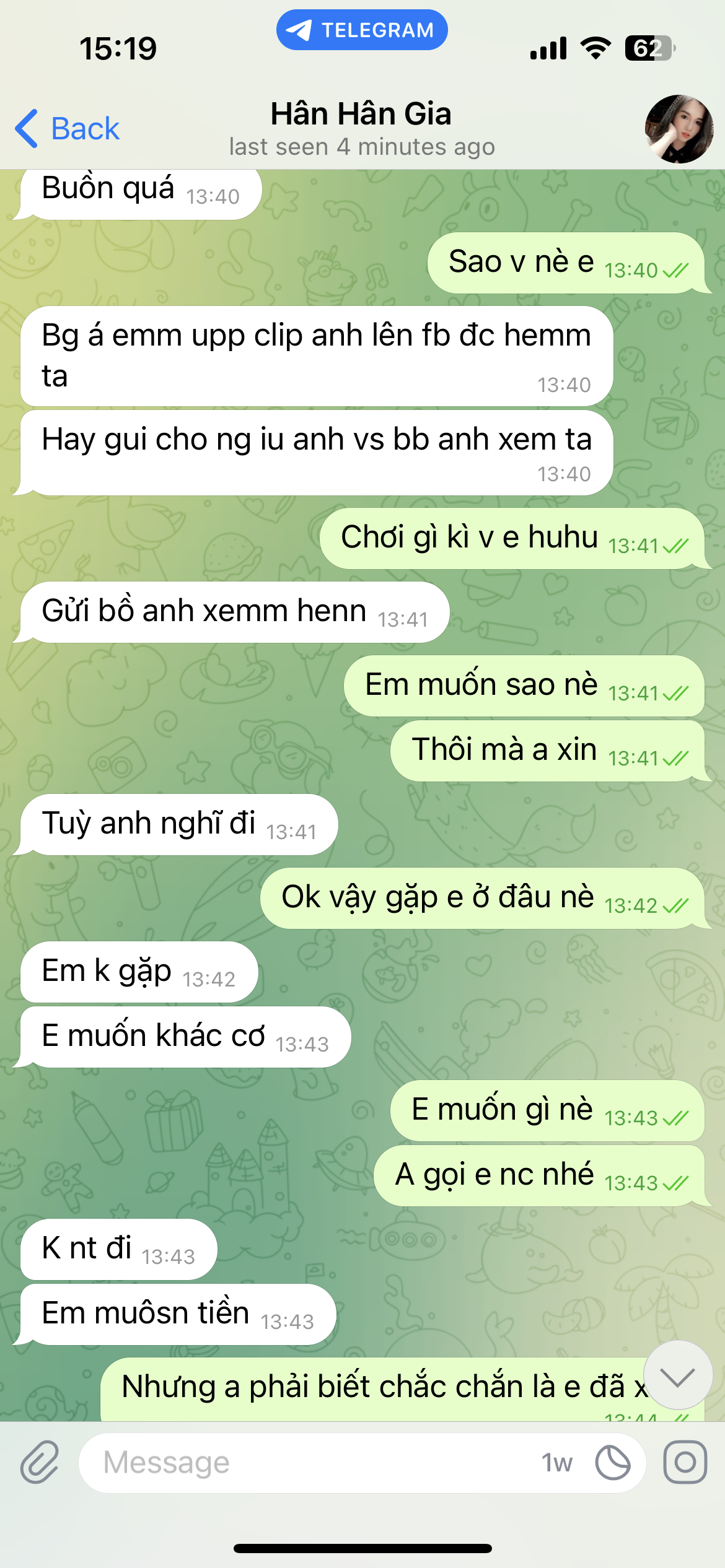 T mới bị con bé 2k2 scam 5 củ, lúc đầu show hình ảnh qua lại, ngu cái đưa fb cho nó. Nói đòi gửi cho bồ t r up lên mạng.. đi toi mẹ 5 củ. Các tml cẩn thận nhé đừng ngu như t huhu.