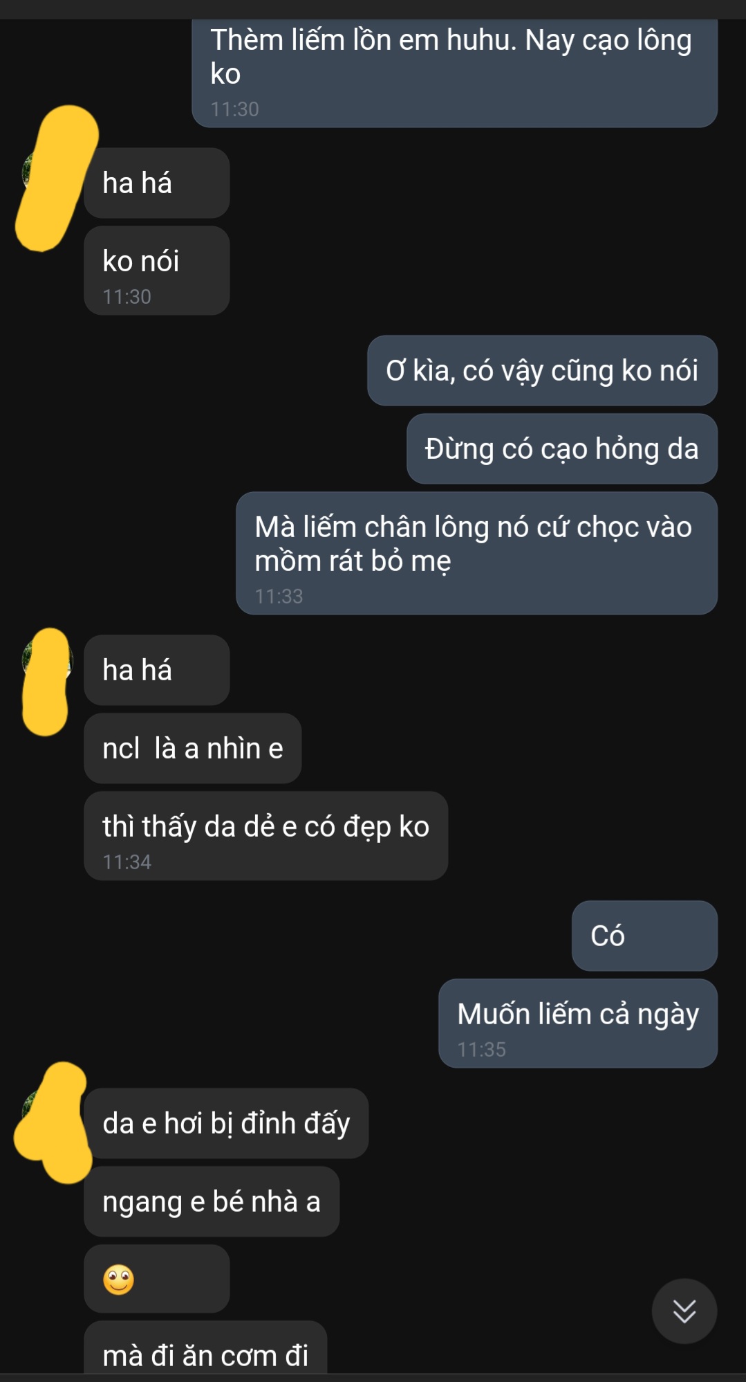 Tin nhắn thì có gì đâu, cả năm nhắn mà. Nó thì ít tục tĩu như tao. Nhưng mình nhắn tục nó cứ thả haha rồi vẫn cứ đến cho sờ nên chắc nó thích nhắn kiểu vậy.Bài thằng thớt này nứng hết chim. Tung thêm tin nhắn đi tml![]()