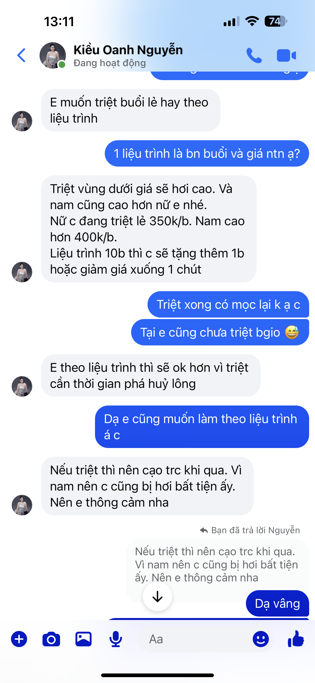 Đây tml. 400k/buổi. Theo liệu trình rẻ hơn. T vừa lấy nick ảo inbox thửrổ giá thế nào tml